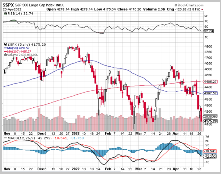 昨夜、主要銘柄の決算や中国でのコロナ広がりの懸念を受けて相場はまた大きく下落しました。終値で4,175.20ポイントとなり、一日で−120.92ポイント、-2.81%の下落です。ダウは-809.28ドルとこちらも大きな下落幅です。