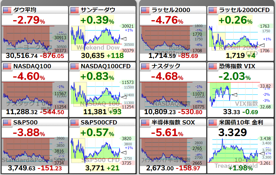 いやはや昨夜もすごかったですね。まさに「終わりの始まり」を予感させる下げでした。画像は現在の先物の様子と合わせて市況を俯瞰したものですが、ナスもSPXもよく下げたものです。