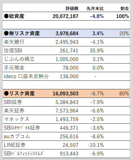 総資産は2,007万円となりました。前月末比およそ-102万円、年初来+131万円の資産増です。内訳はおおよそ80%程度が株式、20%がキャッシュとなっています。なおiDeCoは100%「Slim S&P500」にて運用しています。