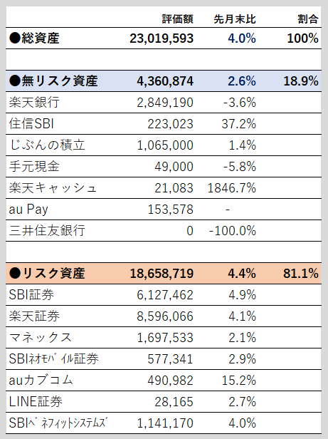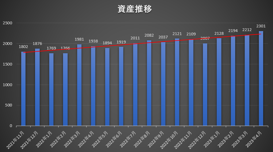 これらの要因が絡み合い、ついに資産額が月末ベースで2,300万円に到達しました。いやはやこの景色はもう少し先であろうと先月末は見ていたので驚いています。